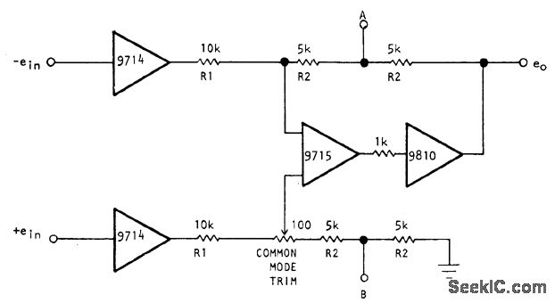 Differential inputs are applied to Optical Electronics 9715 opamp through 9714 voltage followers. Currentbooster using 9810 opamp raises load current to ±100 mA. Complete amplifier has very high differential and common-mode input impedance. Common-mode rejection can be trimmed to greater than 100 dB at 1 kHz for unity gain.Gain is determined by value of resistor RG connected between points A and B and is equal to(2R2/R1)(1 + 2R2/RG). Settling time is 500 ns.Accuracy is maintained from -550C to +85 0C-''Instrumentation Ampliffer, Optical Electronics, Tucson, AZ, Application Tip 10240.