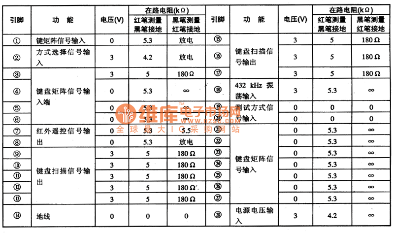 SAA30lOT contains integrated circuit keyboard switch decoding circuit and remote control launch carrier signal circuit, etc.This IC adopts feet 28 DIP package and its pins and data are shown as table 1.