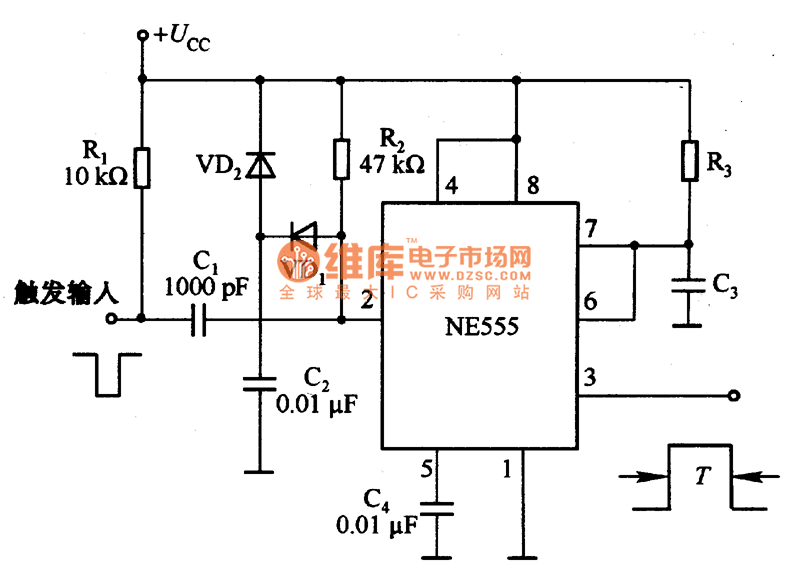 Picture 1 is setting timing circuit of power supply connection.When the power is connected,triggering PWL of ME555 feet 2 is below (1/3)Ucc and feet 3 outputs pulse during the time decided by R2 and C2.Then,+Ucc charges C2 via R2 and VD1 and charging voltage rises to +Ucc.Because of VD1 isolation function,R1 and C1 negative trigger the pulse.VD1 is fast charging diode when the power is off and it can keep the circuit working reliably when the circuit is off and turned on again and again in short time.NE55 outputs T high-level of pulse which is determined by R3 and C3,namely, T=R3C3.