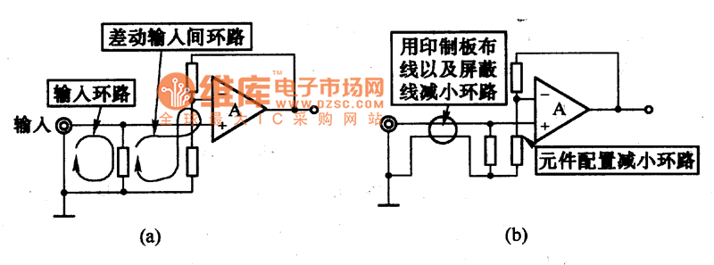 The picture (a) is the loop composed of one circle coils of the op-amp amplifier circuit input end.The magnetic will feel the electric potential when it flows through the loop and there will be noise in op-amp output part.Therefore, we need to pay attention to the components configuration and wiring,anti-noise ability can be strengthen by reducing the area of the loop, and it is shown as figure (b).