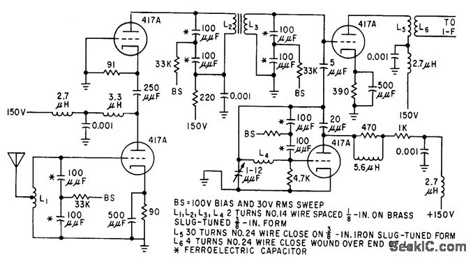Can be made as three plug-in units, each containing the electrically tunable r-f, mixer, and local oscillator stages to cover 35 to 70, 70 to 130, and 130 to 200 Mc. Each plug-in front end has eight voltage-tunable ferroelectric tuners.-T. W. Butler, Jr., Ferroelectrics Tune Electronic Circuits, Electronics, 32:3, p 52-55.