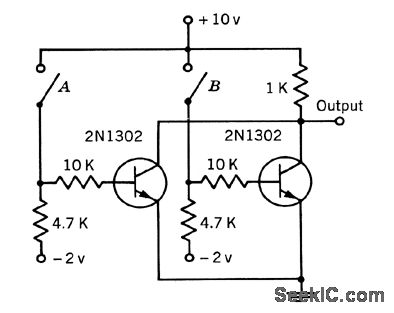 Serves as or gate for normally open switches and as and gate for normally closed switches. Provides phase inversion of input.-Texas Instruments Inc., Transistor Circuit Design, McGraw-Hill, N.Y., 1963, p 388.