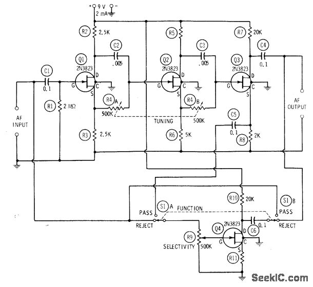 Full rotation of ganged tuning control R4 tunes circuit from 100 Hz to 10 kHz, with position of switch S1 determining whether circuit passes or rejects frequency to which it is tuned. Maximum selectivity, conesponding to maximum height of pass curve or depth of reject curve and minimum width of either curve, is obtained when R9 is set for maximum gain in FET Q4. If R9 is advanced far enough with switch set to pass, circuit will oscllate and give sine-wave output at tuned frequency.-R.P.Tumer, FET Circuits, Howard W, Sams, Indianapolis, IN, 1977, 2nd Ed., p 71-73.