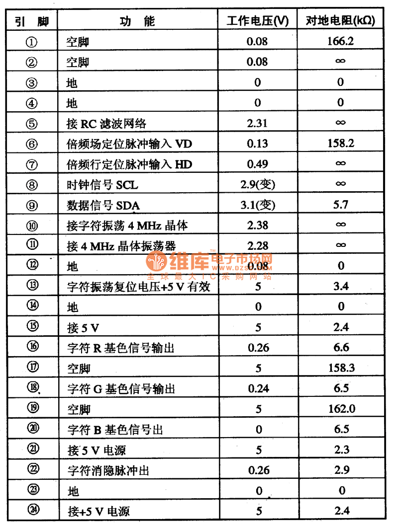 PCA8516 integrated circuit contains the field line positioning pulse processing circuit, characters and clock oscillating circuit, characters and gezer signal circuit, character display vanishing circuit and some other auxiliary functions circuit. The IC adopts 24 DIP package and its pins functions and data are shown as table 1.