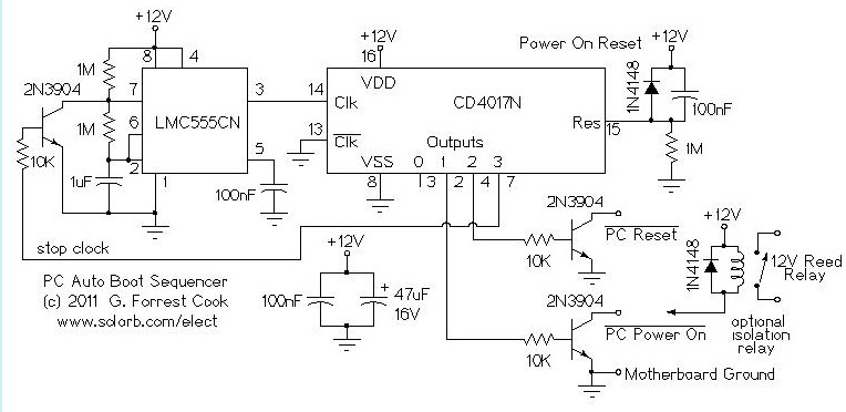 This circuit provides the necessary timing to virtually press the PC's power on switch and the PC's reset switch. If the PC uses an external 12V power supply, such as a Mini-ITX device, power for this circuit can come from the PC's power supply. For larger desktop systems, it may be necessary to power this circuit with an external 12V DC supply such as a wall-wart.