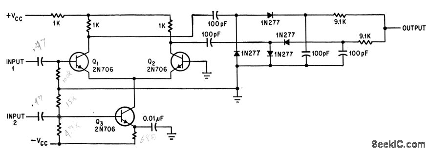 Operates over range of 1kc to 20 Mc without need for tuning. In phase-locking applications, both inputs may be single-ended. Output voltage is proportional to phase difference between input signals.-H. F. Strenglein, Phase Demodulator Needs no Tuning, Electronics, 38:20, p 99.