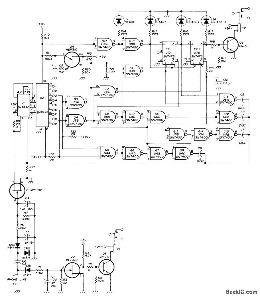 Repeater or other unattended equipment can be turned on or off with ordinary telephone Phone at remote station is called and allowed to ring three times Caller then hangs up, waits 20 s, redials number and lets it ring three times again, then hangs up. Circuit then performs desired control function. Any combination of rings can be used as long as total is less than nine. Decoder U2 is programmed by moving two jumper wires to various outputs of U2. Relay K2 is chosen to give desired momentary, latching, or stepping function. Relay K1 is used for validating phone line, If remote station keying voltage is taken through contacts of K1, interruption of phone line prevents activation of transmitter. C1 stores voltage during brief interruptions such as when phone is ringing. Article gives detailed explanation of ring-counting circuit. LEDs 11-14 indicate status of control sequence and aid in troubleshooting. K1 and K2 are sensitive DPDT relays with 8000-ohm coils. R11 is selected for desired time setting.-R. C. Heptig, Automatic Telephone Controller for Your Repeater, Ham Radio, Nov. 1974, p 44-48.