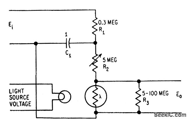 Combines low noise level With resistance to vibration.R1 prevemls bumup of photocell,R2 glves maximum conversion efficency at setting of about 2.2 meg.C1 averages d-c input signal fluctuations so they do not exceed 120-cps chopping frequency of light source.-R.G. Seed,Chopper Uses New Photocells,Electronics,31:21,p90-98.
