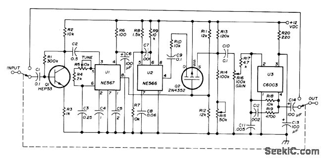 Permits comfortable listening to CW signals deeply embedded in noise, hash, and interference, by detecting one particular CW transmission and keying independent oscillator with its signal. Consists of signal amplifier Q1, narrow-band PLL frequency detector and trigger U1, PLL function generator U2, gate Q2, and AF output amplifier U3. In absence of triggering signal, output pin 8 of U1 presents high impedance to ground. With trig-gering frequency, output presents low impedance to ground. Oscillator U2 is gated by un through Q2.-C. R. Lewartand R. S. Libenschek, CW Regenerator for Interference-Free Communications, Ham Radio, April 1974, p 54-56.