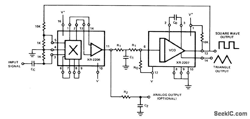 Highly stable and precise phase-locked loop system using Exar XR-2207 VCO and XR-2208 operational multiplier is suitable for wide range of applications in data transmission and signal conditioning. Supply voltage range is 16 V to ±13 V. For 10-kHz center frequency, Rois 10K and Co is 0.01μF. R1 and C1 which determine tracking range and low-pass filter characteristics, are 45K and 0.032μF,- Phase-Locked Loop Data Book, Exar Integrated Systems, Sunnyvale, CA, 1978, p 62-64.