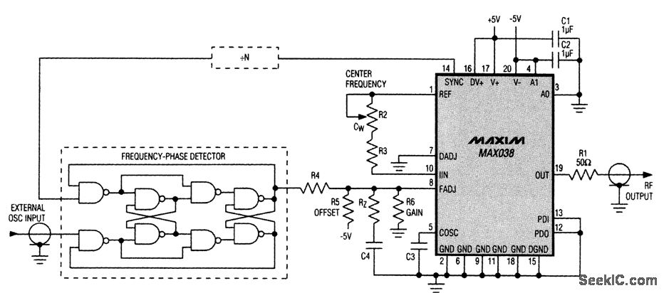 The MAX038 function generator IC can be used in a PLL system. To gain the advantages of a wider capture range and an optional divide-by-N circuit (which allows the PLL to lock onto arbitrary multiples of the applied frequency), you can introduce an external frequency-phase detector, such as the 74HC4046 or the discrete-gate version shown. Unlike phase detectors, which can lock to harmonics of the applied signal, the frequency-phase detector locks only to the fundamental. In the absence of an applied frequency, its output assumes a positive dc voltage (logic 1) that drives the RF output to the lower end of its range as determined by resistors R4 to R6. These resistors also determine the frequency range over which the PLL can achieve lock. Again, R4 to R6, C4, and RZ, determine the PLL's dynamic performance.
