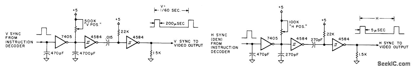 Six Inverters serve for moving entire character display to any position on TV screen,Display is produced by microprocessor through alphameric data-to-video converter. Circuit requires continuous feed of H and V signals from instruction decoder of microprocessor.-D. Lancaster, TVT Hardware Design, Kilobaud, Jan. 1978, p 64-68.