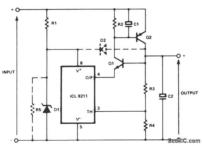 In the circuit, Q1 and Q2 are connected in the classic SCR or thyristor configuration. Where higher input voltages or minimum component count are required, the circuit for thyristor boost can be used. The thyristor is running in a linear mode with its cathode as the control terminal and its gate as the output terminal. This is known as the remote base configuration.
