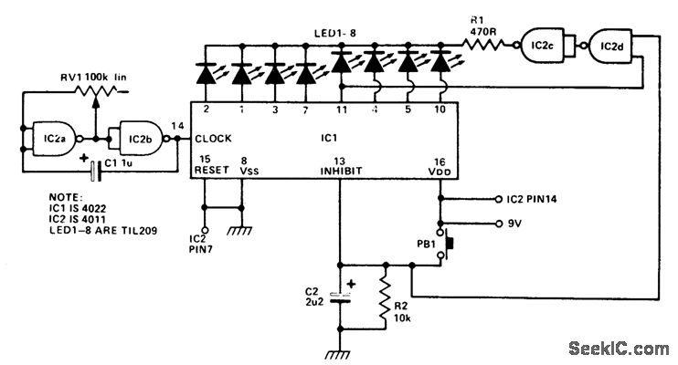 This is a circuit for a game of the shooting gallery variety. IC2a and b form an astable multivibrator clocking IC1 which causes LEDs 1-8 to flash in turn LED 5 is the target LED and the object of the game is to depress PBI just as LED 5 comes on. If this is done, the whole display is blanked for a few seconds signifying a hit. Otherwise, the LED which was lit remains lit. When the push button is released, C2 dis-charges through R2 taking 8 pin 13 low again and the LEDs will start to flash again.