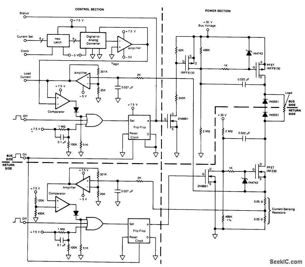 This circuit provides on/off switching, soft starting, current monitoring, current tripping, and protection against overcurrent for a 30 Vdc power supply at normal load currents up to 2 A. The switch is turned on by an“on”command pulse; it is turned off by an“off”command pulse. An overcurrent trip can also be set on the bus side by a 6-digit binary signal, which is converted to an analog voltage and compared with the amplified voltage developed across a loadcurrent-sensing resistor. Resistor/capacitor combinations(0.027 μF, 2 kO)at the inputs of the current-sensing amplifiers act as low-pass filters: this introduces a few hundred its of delay in the response to overcurrent, thereby providing some inununity to noise. The 0.022 pF capacitors connected to the drain terminals of the PFETs provide a Miller effect, which reduces the rate of change of the drain voltage and therefore the rate of rise of current at turn-on. The soft-turn-on time depends upon the load impedance and is typically 100 to 200 ms.