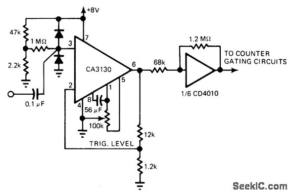 Combination of CA3130 and CD4010 ICs provides broad fre-quency response at very low power levels, as required for driving frequency counter. Diodes protect input from overvoltage. Amplifier offset control pot is used as trigger level control. Input sensitivity of amplifier/trigger combination is 50 mV P-P from 1 Hz to 1 MHz.-R. Tenny, Counter Pre-Amp Matches CMOS Logic Capability, EDN Magazine, Sept. 20, 1976, p 114 and 116.