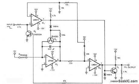 If you need a wide-range, resistor-programmable monostable multivibrator, you can program the circuit for pulse widths from 1 μs to 10s-107:1 range. A high-to-low transition at the input causes IC1's output to switch low, thereby turning off Q1 and Q2. With the latter transistor turned off, IC3's output increases and the output of IC2 begins to ramp toward the negative supply level at a rate determined by the 0.01-μF capacitor and the programming resistor. When IC2's output voltage reaches -5 V, IC3's output switches low. If you anticipate input pulses shorter than the desired output pulses, Q3 is necessary. This transistor keeps IC1s input low while an output pulse is present, thereby preventing inadvertent resetting of the one shot.