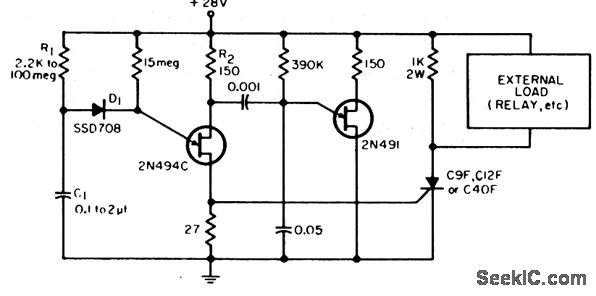 Gives time delays over 3 minutes without need for tantalum or electrolytic capacitor. Timing capacitor C1 can be mylar unit. Application of power in itiates timing of power, which is determined by R1-C1. Al end of interval, 2N494C fires other scr, to place supply voltage across load.-D. V. Jones, Precision Solid-State Delay Circuit, EEE, 11:12, p 26-27.
