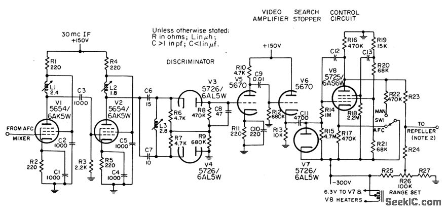 For use in pulse-modulated systems, to maintain a difference of 30 Mc between Transmitter and local oscillator frequencies. If local oscillator is required to operate 30 Mc below transmitter, discriminator diodes V3 and V4 should be reversed. Circuit is a hunting system, because local oscillator is swept over band of frequencies to find correct operating point. During search, phantastron V8 acts as saw tooth generator to provide sweep voltage for control element of local oscillator (repeller of klystron).-NBS, Handbook Preferred Circuits Navy Aeronautical Electronic Equipment, Vol. I, Electron Tube Circuits, 1963, PC 53, p 53-2.