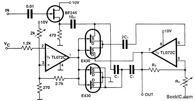 The circuit gives a programmable bandpass where both the cut-over frequency andthe gain,A,are controlled independently.In the twin-T bridge the resistors R and R/2 are replaced by two double FETs,E 430,the channel resistance of the first one in thesenes,the channel resistances of the second one are in parallel as to stimulate the resis-tance R/2. Both these resistors are controlled by Vc which ranges from 0 V to about1 V. The gain of the circuit is set by means of the resistors R2 and R3.