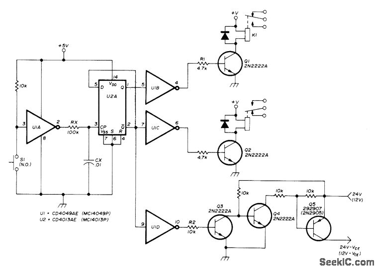 Eliminates need for holding down microphone switch continuously while transmitting. U1 is inverting hex buffer, and U2 is dual CM0S D flip-flop. When S1 is depressed, input to U1A goes low and its output goes high, making U2A and U1B together turn on Q2 and energize relay K1. Q3-Q5 serve as optional silent power switch for use when relay noise is objectionable.-B. Lambing, DC Latch Circuit, Ham Radio, Aug. 1975, p 42-44.
