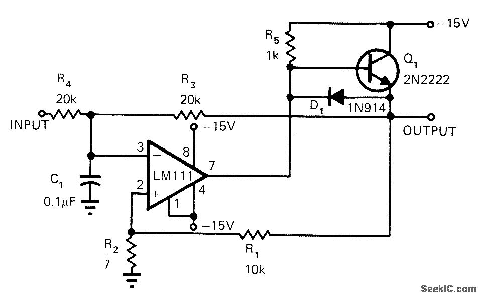 LM111 comparator serves with single transistor to provide pulse-train output whose average value is proportional to input voltage. Frequency of output is relatively constant but pulse width varies .Pulse-ratio accuracy is 0.1%. Circuit can be used to drive power stage of high-efficiency switching amplifier, or as pulse-width/pulse-height multiplier. Article tells how circuit works.-R.C. Dobkin, Comparators Can Do More than Just Compare, EDN Magazine, Nov. 1, 1972, p34-37.