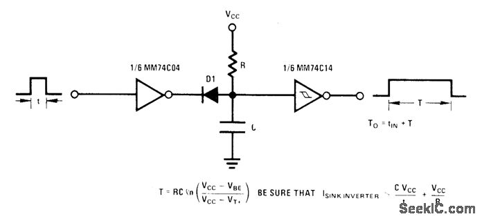 Section of CMOS MM74C04 inverter accepts positive input pulse by going low and discharging C. Capacitor is rapidly discharged, driving input of MM74C14 Schmitt trigger low. Output of Schmitt then goes positive for interval To which is equal to input pulse duration plus interval T that depends on values used for R, C, and supply voltage.- CMOS Databook, National Semiconductor, Santa Clara, CA, 1977, p 5-30-5-35.