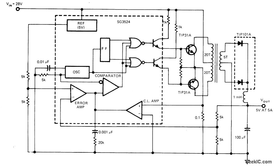 Transformer-coupled push-pull output for SG3524 fixed-frequency pulse-duration- modulated switching regulator gives output flexibility, allowing for multiple outputs and wide range of output voltages. Each output transistor operates alternately at half of switching frequency. Switching regulator applies voltage alternately to opposite ends of transformer primary, making transformer perform as if it had AC input. TIP101A rectifier then provides desired 5-VDC output at 5A.-J. Spencer, Monolithic Switching Regulators-They Fit Today's Power-Supply Needs, EDN Magazine, Sept. 5, 1977, p 117-121.