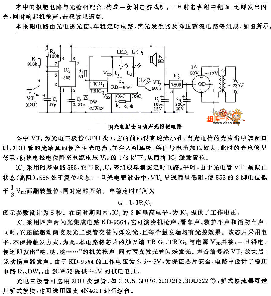 In the figure, VT1 is photoelectric triode(3DU type), there is a light hole in front of it, when the photoelectric gun's light beam hits this window, 3DU tube's photosensitive base surface will produce photocurrent, and it is injected into the base collector, the signal current is amplified, then the photoelectric tube is low resistance, the collector level is dropped below 1/3 power supply VDD, IC1 is triggered and set.