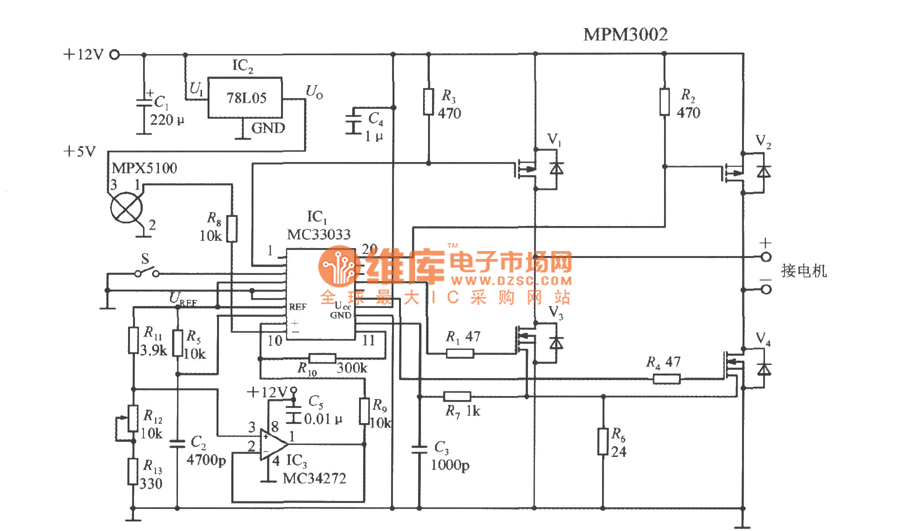 A practical circuit pressure regulating system is shown in Fig . +12 V power supply through 78L05 (IC2) to get +5 V voltage , a separate power supply to the MPX5100 . The remaining circuits are used +12 V power supply. MC33033 (IC1) for the motor controller , MC34272 (IC3) is a dual op amp ( currently only one op amp ) . To improve efficiency, the motor drive circuit uses a MPM3002 -drive module internally by two P -channel power FET (V1, V2) and two N -channel power MOSFETs (V3, V4) bridge consisting of H , drive current up to 4A. Can drive DC brush motors. To avoid system noise or small pressure fluctuations caused by measurement error , but also specifically to increase the hysteresis circuit using MC33033 internal error amplifier and an external resistor R8 ~ R10, there is a lag effect constitutes a comparator . Its working principle is to open the motor when Uo <UREF time ; With the rising pressure of the pool , when the sensor output voltage is equal to the reference voltage hysteresis voltage (UH) the sum , ie Uo = UREF + UH when the motor is turned off , the system pressure reduction . Thereafter , the sensor output voltage will always be equal to the reference voltage drop when the motor turned up . Take R8 = R9 = 10kΩ, R10 = 300kΩ , the hysteresis voltage of 0.3V, corresponding to 7.5kPa lag pressure. Circuit switch S can be used to control the motor forward or reverse .