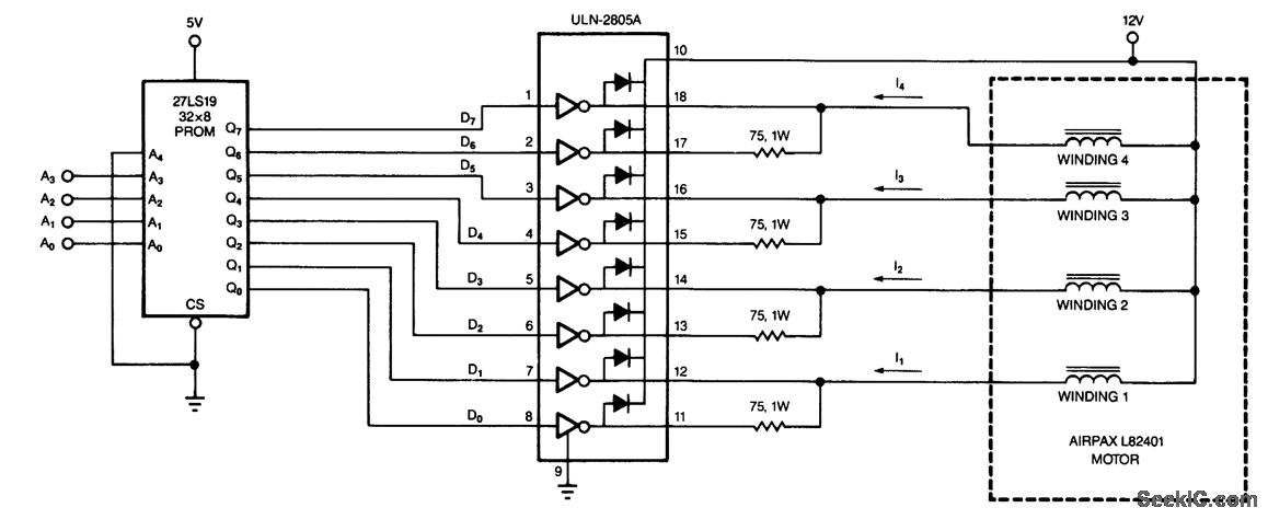 Using a counter and a PROM, this circuit drives the stepper windings with two levels of current.