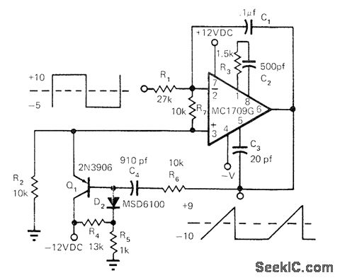 10 V-Based on use of integrating opamp to generate triangle wave from square wave. Circuit goes one step further by convening triangle to ramp function having predetermined negative starting level of -10V. When square-wave input signal changes in polarity from positive to negative, output of circuit begins to go positive as ramp function and C4 charges with output voltage. When input changes from negative to positive and output begins to go negative, Q1 conducts and drives noninverting input of opamp negative. Since square-wave input is positive at this time, opamp output is forced to go negative at its slew rate. Output then remains negative until square-wave input switches in negative direction for repeating cycle.-L. Wing, Op Amp and One Transistor Produce Ramp Function, EDN Magazine, Nov. 15, 1972, p 49.