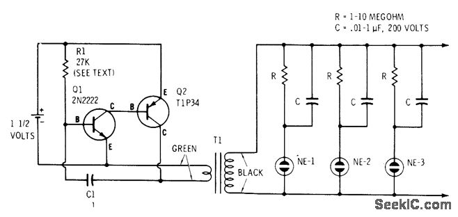 Neon glow lamps such as Radio Shack 272-1101 flash in unpredictable sequences at various rates that are determined by values of R and C used for each lamp, to give attention-getting display for classrooms and Science Fairs. Value of R1 can be as low as 2200 ohms for higher repetition rates, but battery drain increases. When circuit is energized, each neon receivesfull voltage and fires. Lamp capacitor begins charging, decreasing voltage across lamp until lamp goes out and cycle starts over. Use of different capacitor values makes lamps recycle at different rates. T1 is 6.3-VAC filament transformer used to step up oscillator voltage.-F. M. Mints, Transistor Projects, Vol, 2, Radio Shack, Fort Worth, TX,1974, p 43-52.