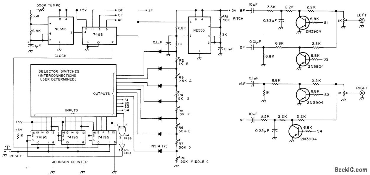 Uses Johnson counter as special shift register producing almost random bit patterns of 18 to 3255 12-bit words under control of clock operating in range of about 1-10 Hz. Oscillator (upper right) uses NE555 as voltage-controlled square-wave generator playing one of eight musical notes (C. D. E. F. G. A. B. or C), depending on state of seven noteselector lines coming from selector switches. Oscillator is divided down in frequency by three-stage ripple counter to provide four octaves of range. R1 -R8 serve fortuning each note to pitch. Outputs 8F and 2F are paired to drive left input of stereo amplifier, while outputs 16F and 4F are similarly paired for right channel. Article covers construction, tune-up, and creation of pleasing musicalsequences.-D. A. WalIace. The Sound of Random Numbers. 73 Mag-azine. Feb. 1976, p 60-64.