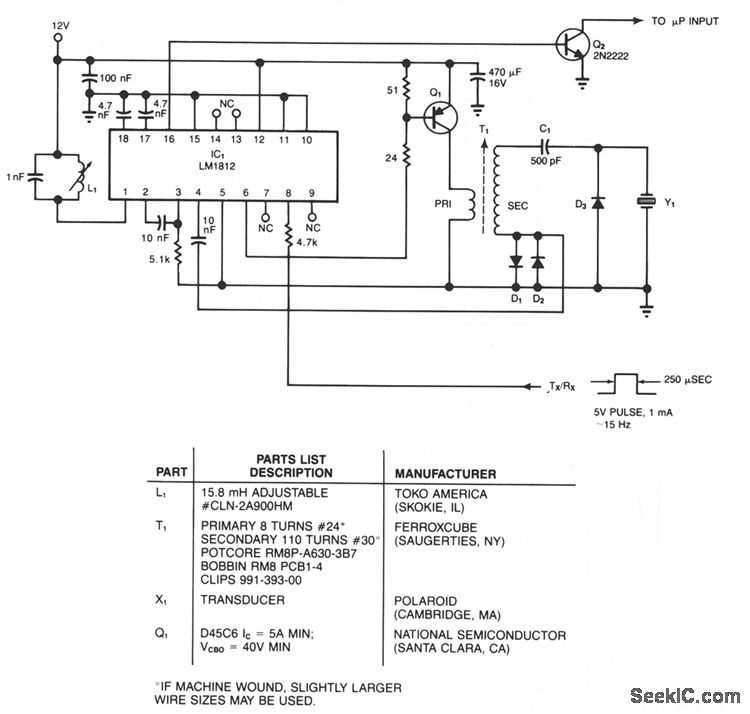 Combine an electrostatic transducer with an ultrasonic transceiver IC to build a ranging system that senses objects at distances from 4 inches to more than 30 feet. Transducer Y1's broadband characteristic simplifies tuning. The secondary of T1 resonates with the 500-pF capacitor C1 at a frequency between 50 and 60 kHz. You tune L1 to this frequency by using an oscilloscope to note the maximum echo sensitivity at pin 1. Step-up transformer T1 prov.ides 150-V bias for the transducer.