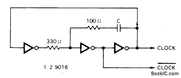 Simple TTL clock generator is suitable for most TTL systems. Requires only half of hex inverter package and three passive com ponents. Clock frequency depends on value of C: 200 pF gives 5 MHz; 1600 pF gives 1 MHz; 0.018 μF gives 100 kHz; and 0 18 μF gives 10 kHz.-Circuits, 73 Magazine, Aug. 1974, p 99.