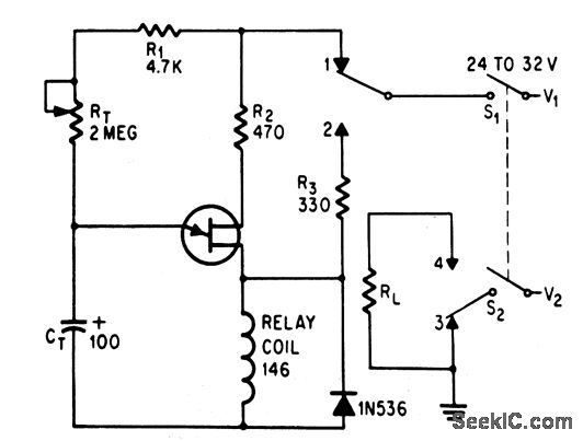 Uuijunction transistor is used to delay operation of relay from 0.5 sec to 3 minutes. CT-RT determine delay interval.-D. V. Jones, Quick-On-The-Trigger Design, Electronics, 38:12, p 105-110.