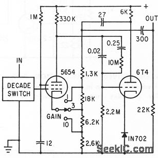 With input resistance of 1,000 meg,piezoelectric gage amplifier gives gain choices of 1,3,or 10 for loads above 2,500 ohms.Decade input swith can provede choice of shunt capacitances for trimming sensitivety of gages.-Extending Piezoeldtric Gage L-F Response,Electronics,36:4,p 100-103.