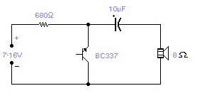 There are a number of npn transistors that will oscillate in the audio range when reverse biased. Minimum supply voltage is 7V for low power transistors such as BC109, BC238 and 2N2222A (about 10V for the latter), it becomes 12V for medium power transistors such as BD139 and is 16V for power transistors as BUX22 and 2N6543. Current drain is 4mA at 9V and frequency of oscillation is 550Hz. The base is normally left open.