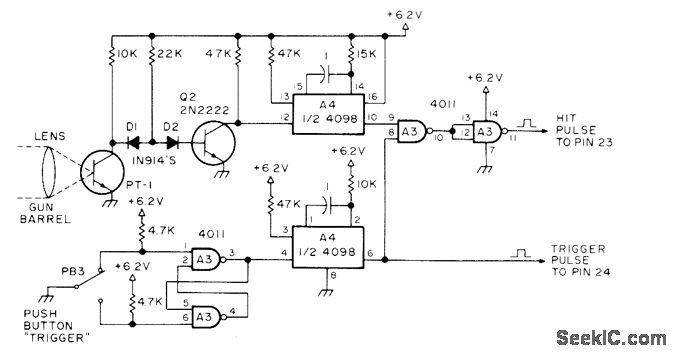 Developed for use with General Instruments AY-3-8500-1 TV game chip to simulate target practice with rifle. Player aims at bright target spot moving randomly across TV screen.If gun is on target when trigger is pulled, phototransistor in barrel picks up light from target and generates pulse for producing sound effect of hit and incrementing player's score. PT-1 can be TIL64 or equivalent phototransistor, 4098 is dual mono, and 4011 is quad two-input NAND gate. Pulse outputs go to pins of game chip.Article gives all circuits but covers construction only in general terms.-S. Ciarcia, Hey, Look What My Daddy Built!, 73 Magazine, Oct. 1976, p 104-108.