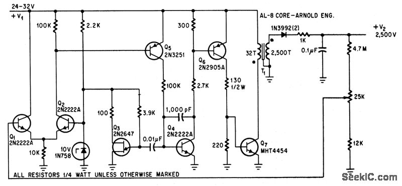 Steps up 32-V d-c pulses to 2.500-V d-c pulses,with regulation of 0.02%, achieved by sampling output and feeding it back to comparision circuit. Uses unijunction transistor Q3 with 04 for pulse generation.-J. F. Howell,Ringing Choke Simplifies D-C to D-C Conversion, Electronics, 39:8, p90-92.