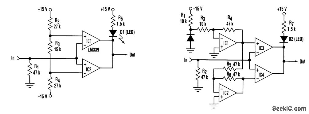 The tester is basically a window comparator, in which the low and high levels are set at +3.0 V and -3.0 V, respectively, by resistors R2, R3, and R4. Resistor R1, when not driven by an RS232 output, will have a low voltage across it (approximately 0 V), and the LED D1 at the output of the comparators is turned off. If the unknown wire of the cable that is tested is an RS232 output, then it will drive the in point to avoltage either between +3 and +12Vor between -3 and -12 V. In both cases, one of the two comparator outputs will be driven low. This turns the LED on, indicating the presence of a wire connected to an,RS232 output. The comparator should be an LM339 type or equivalent (with an open-collector output). The disadvantage of this scheme is that the thresholds are very sensitive to the supply variations. To eliminate this problem, the thresholds at the inputs of the comparators can be created using the normal forward drop on a simple diode and then be brought to the necessary leyels by IC1 (+3 V at its output) and IC2 (a simple inverter).
