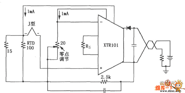 This circuit use J type RTD. Its resistance value corresponding to the temperature can be checked through at RTD factory offered table. It uses 20Ω zero adjustment potentiometer to zero point correction.