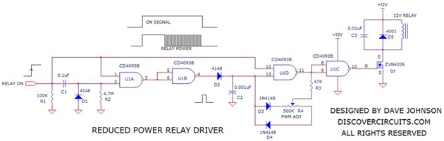 Relays can handle a lot of power. However, for certain power sensitive designs you would like to reduce the power needed to hold a relay closed. The circuit below performs such a task. It uses a single CD4093 quad NAND gate. When the ?on? logic input signal is detected, the relay is first pulsed on for about 500ms. This is sufficient time to insure the relay is fully closed. After that initial pulse the relay is then driven with a square wave signal, whose duty cycle can be adjusted. The signal duty cycle can be adjusted from about 10% to 90%. In most cases a 50% duty cycle will hold the relay closed. This reduces the average DC current required by the same factor, which means a 4:1 reduction in power. The circuit can operate over a wide 3v to 15v range.
