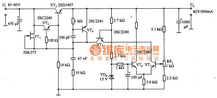 The above picture is regulated power supply Circuit with 42V/500mA output.In the circuit, VT1 adopts UDS = 1 of OOV mosfet 2 SK373 to constitute a high voltage constant current source.Besides the field effect tube,constant current diode E-202 is also avaliable.Largest work voltage of E-202 is 1OOV and its rated power is 3 OmW.VT6 and VT7are error amplifiers and they use the UcEo. 2SC2240 is 12OV high pressure transistor and VT5 constitutes cascode amplifier to improve frequency characteristics of the error amp.