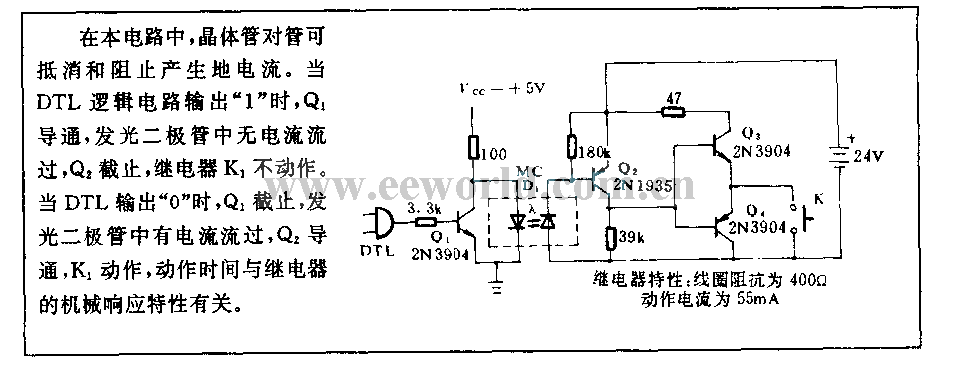 In the circuit, transistor can offset and prevent the producing current to the tube. When DTL logic circuit output 0 , Q1 cut off, there is current flows go through in the LED, Q2 cut off, relay K1with no action. When DTL logic circuit output 1 , Q1 breakover, there is no current flows gothrough in the LED, Q2 breakover, The action time is connected with the mechanical response characteristics of relay.