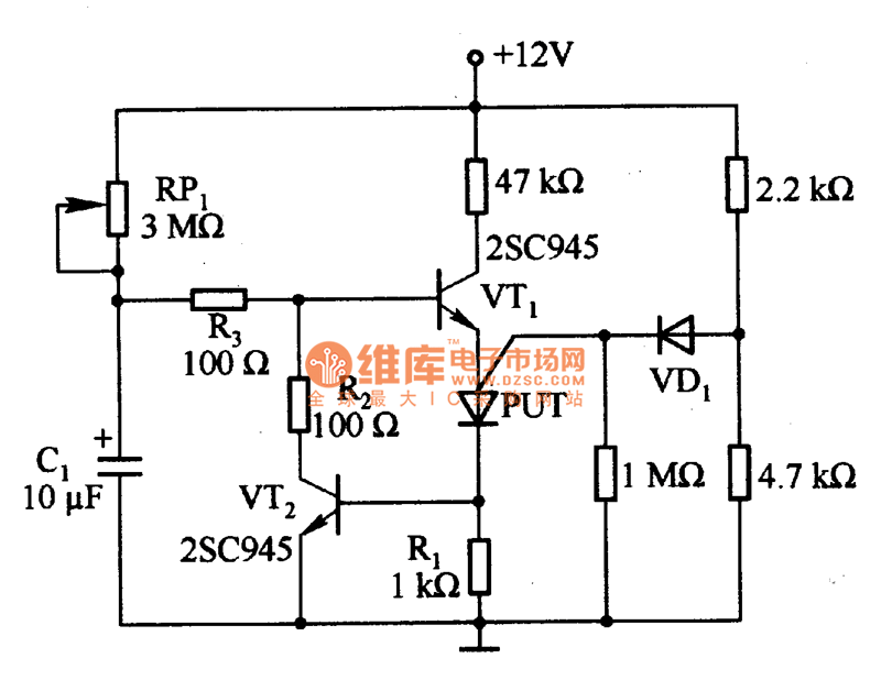 Figure 1 is the repeat timing circuit formed by PUT. It is a repeat timing circuit composed by one PUT, two transistors and a diode, which is not effected by the change of the the power supply voltage and the temperature and has long-term stability. When PUT conducts, the anode current is shunted by the transistor VT2, the base current of VT1 is cut off and the PUT resets. The negative temperature coefficient of VD1 makes a temperature compensation to the offset voltage of PUT. The RP1 resistance is larger, which is 3 MΩ, so we should choose the gold/film resistor with small temperature effect and C1 selects a knob capacitor with small leakage current.