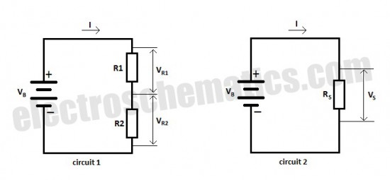 In circuit 1 we have 2 resistors R1 and R2 connected in series and in circuit 2 is shown the equivalent resistor Rs. I is the current that flows through the resistors and VB is the voltage of the battery or power supply.