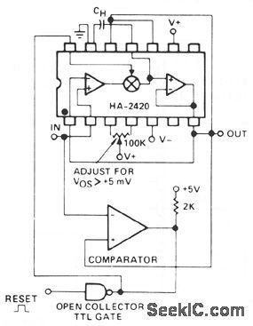 The sample-and-hold function has often been accomplished with separate analog switches and op amps. These designs always involve performance tradeoffs between acquisition time, charge injection, and droop rate. The HA-242-/2425 monolithic sample-and-hold, has many better tradeoffs, and usually a lower total cost than the other ap-proaches. The switching element is a complementary bipolar circuit with feedback, which allows high charging currents of 30 mA, a low charge injection of 10 pC, and an ultra-low off leakage current of 5 pA; a combination that is not approached in any other electronic switch. These factors make it also superior as an integrator reset switch, or as a precision peak detector.