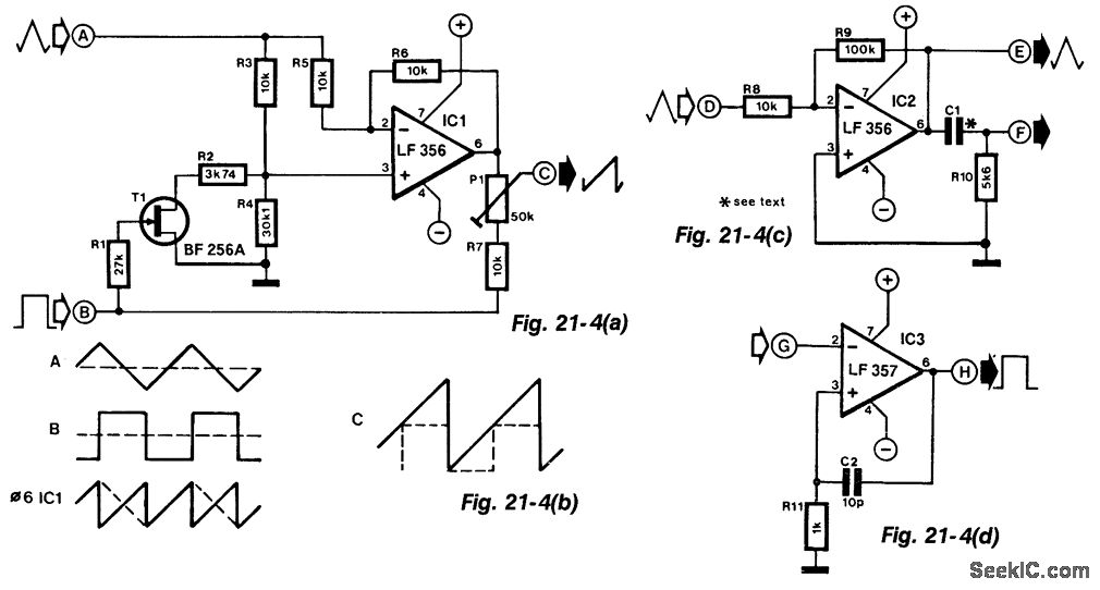 If a rectangular signal is not available, or if its peak value is too small, the auxiliary circuits (shown in Figs. 21-4(c) and 21-4(d)) will be found useful. Figure 21-4(g) amplifies the triangular input at A by 10. Differentiating network C1/R10 derives rectangular pulses from the amplified triangular signal and these are available at F.